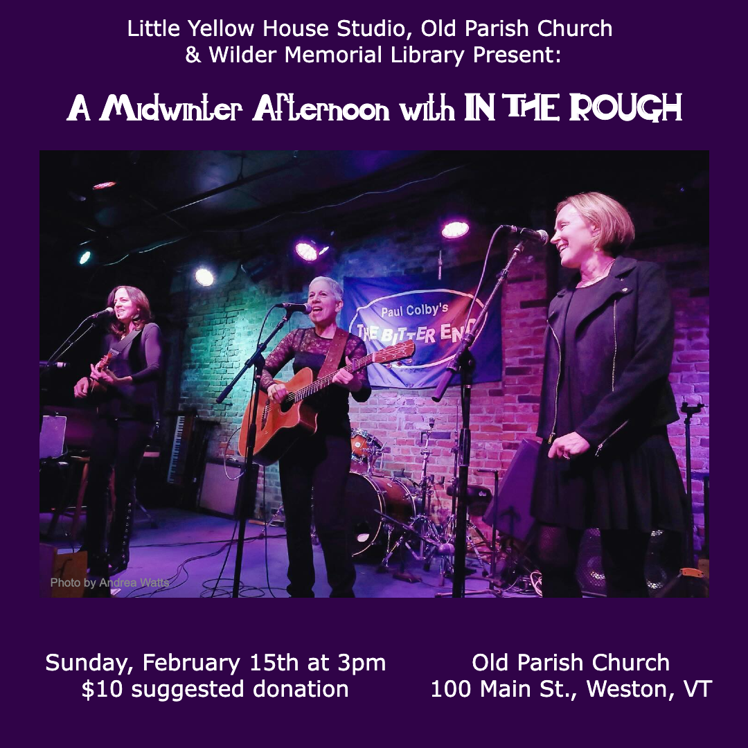 Little Yellow House Studio, Old Parish Church & Wilder Memorial Library present A Midwinter Afternoon with In The Rough, a concert featuring the vocal trio In The Rough (Lisa Brigantino, Lori Brigantino and Susan Haefner) on Sunday, February 15th at 3pm at the Old Parish Church in Weston, VT.  The concert will include traditional and contemporary folk songs, old-time tunes, as well as original songs and even a sing-along.  Doors open at 2:30pm.  Suggested donation of $10.
